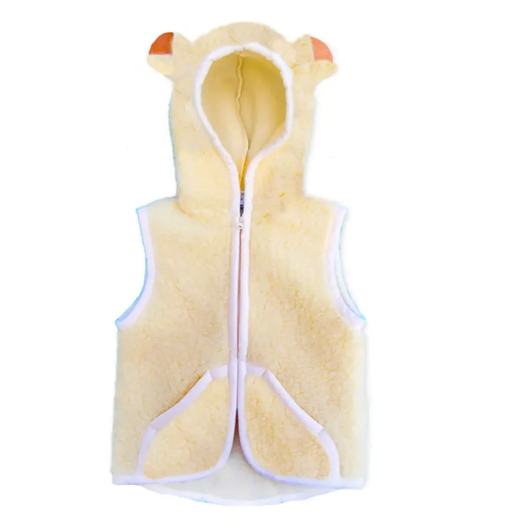Detská vesta z ovčej vlny so zapínaním na zips chráni vaše deti proti chladu a prievanu. Vesta má kapucňu s roztomilými uškami a po stranách malé vrecká. Vďaka ovčej vlne je vaše dieťa v konštantnej teplote, ktorá pravá ovčia vlna udržuje.