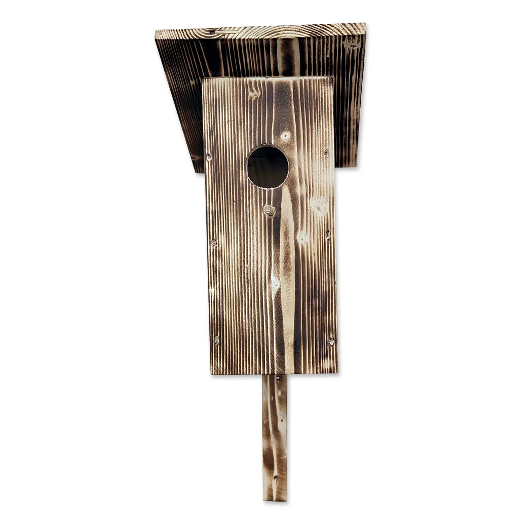 Štýlová drevená vtáčia búdka z masívu s opaľovaným povrchom, ideálna pre záhradu, balkón alebo terasu. Poskytuje bezpečné útočisko pre drobné vtáctvo a zároveň slúži ako dekoratívny prvok.