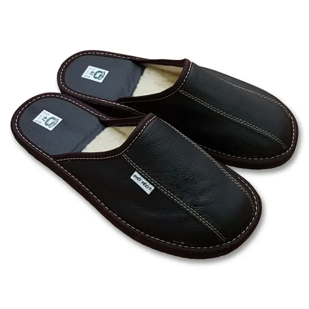 Kožené luxusné pánske papuče s ovčou vlnou a kvalitnou odpruženou podrážkou na tlmenie nárazu pri chôdzi. Vhodné na vnútorné chodenie.