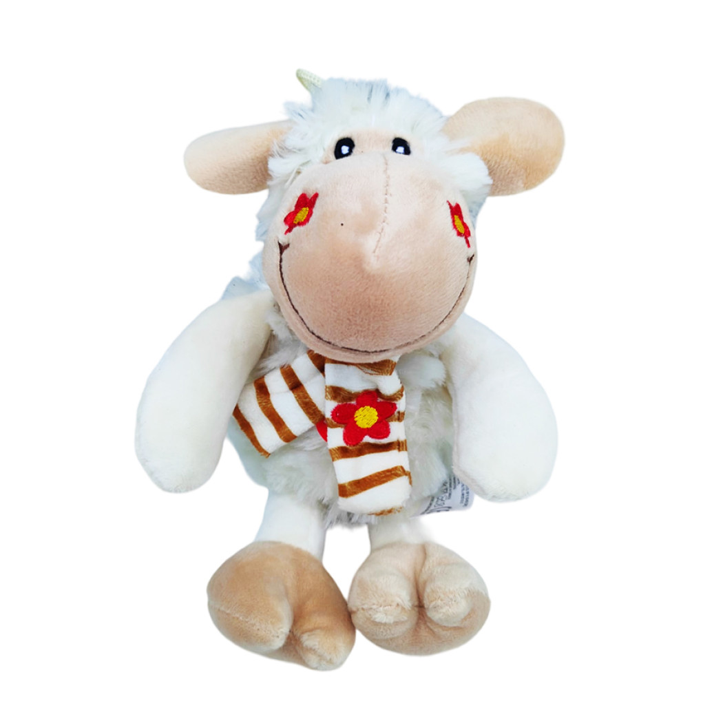 Roztomilá plyšová ovečka so šálom a bečiacim hlasom.