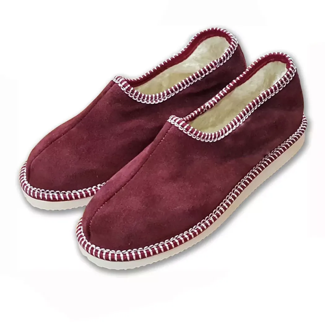 Pohodlné domáce papuče s ovčou vlnou vo vínovej farbe s podrážkou tlmiacou nárazy. Šľapky sú vo vnútri s ovčou vlnou a sú s uzavretou pätou.