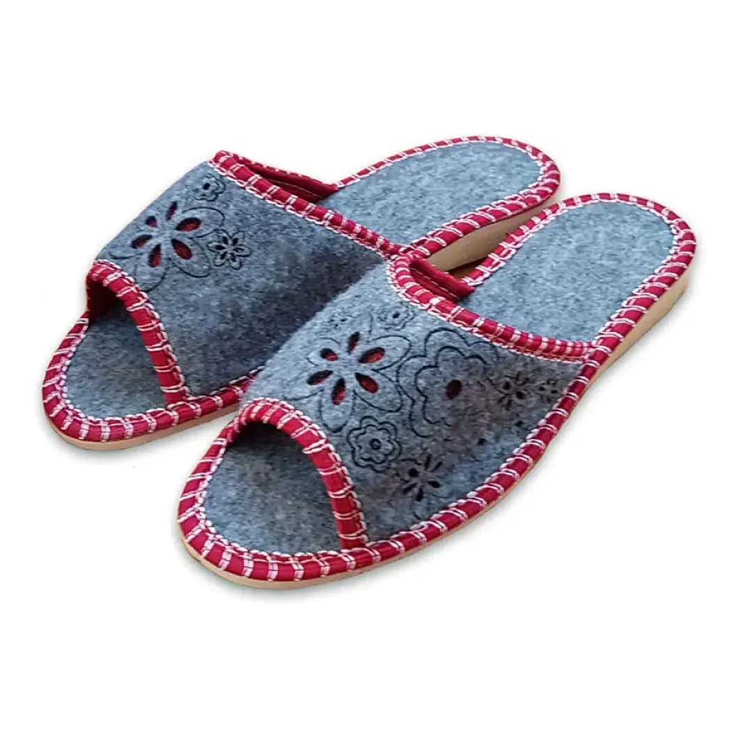 Dámske filcové šľapky otvorené - štýl, elegancia a pohodlie Doprajte si maximálny komfort s dámskymi otvorenými šľapkami s vyrezávaným vzorom z kvalitného filca, ktoré vás očarí svojim elegantným šedým dizajnom s červeným olemovaním. Vnútro papučiek je vyplnené jemným filcom, ktorý poskytuje prírodné teplo a pohodlie počas nosenia. Gumová podrážka s ortopedickým klenutím zaisťuje správnu podporu chodidla a príjemnú chôdzu.