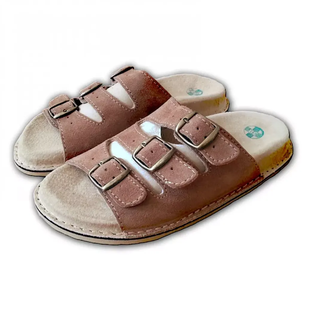 Ortopedické kožené pánske a dámske šľapky s nastaviteľnými remienkami. Podrážka odmäkčená gumová s tvarovou pamäťou tlmiacou nárazy a anatomickým klenutím.